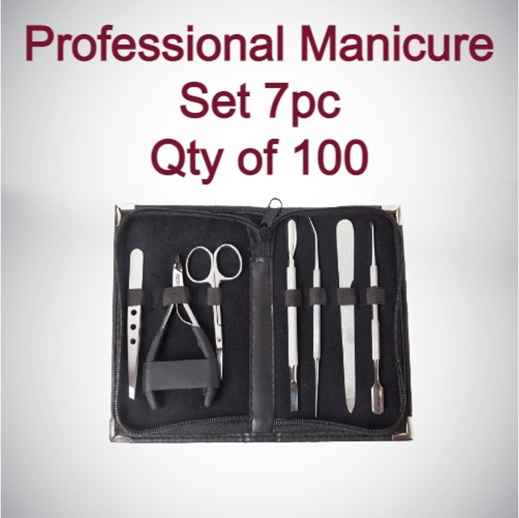 Grab this all-inclusive manicure set for your students today. the Vinyl zippered case includes steel manicure implements such as a precision slant tip tweezer, box joint full jaw nipper, 3 ½” cuticle scissor, cuticle push with beveled spoon and square ends, metal file, ingrown nail file, and cuticle trimmer with scoop- case of 100.